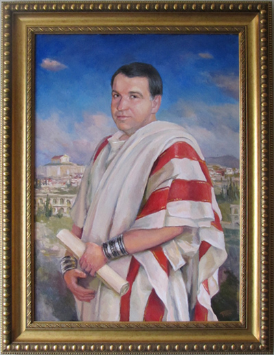 Сотрудники компании "Трайпл" решили сделать оригинальный подарок своему шефу на день рожденья в виде портрета. За этим они и обратились ко мне. Юрий Чиж должен был быть изображен в каком-то историческом образе, но мундир чиновника или генерала 19 века, казался им слишком банальным. Тогда совместно мы решили сделать из него римского патриция.