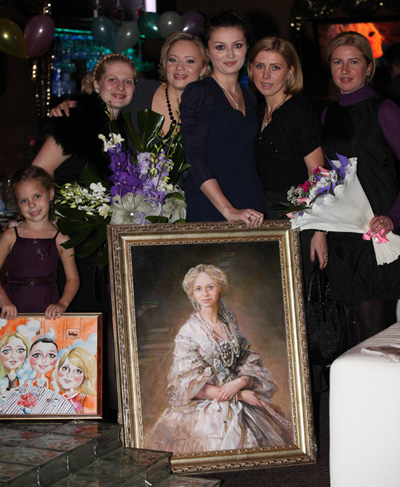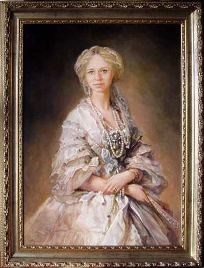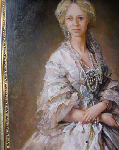 Девушки решили сделать оригинальный подарок своей подруге – портрет по фотографии, а так же в комплект к нему был еще заказан групповой шарж. Портрет хотелось сделать необычным, представить девушку в каком-то необычном виде, нужно было подобрать образ подходящий именно ей. Я предложил использовать для создания картины классический портрет императрицы Марии Александровны работы известного придворного портретиста Франца Ксавье Винтерхальтера. Заказчицам выбранный мной образ очень понравился. Единственная сложность состояла в том, что девушка, которую мне необходимо было изобразить была блондинкой, а главный тональный акцент в портрете Франца Ксавье Винтерхальтера – черные волосы императрицы Марии Александровны. Но эта проблема была решена: контрастный темный фон подчеркнул светлый образ изображенной мной девушки, которая впоследствии к своему портрету решила прибавить еще один, заказав у меня классический портрет своего мужа.