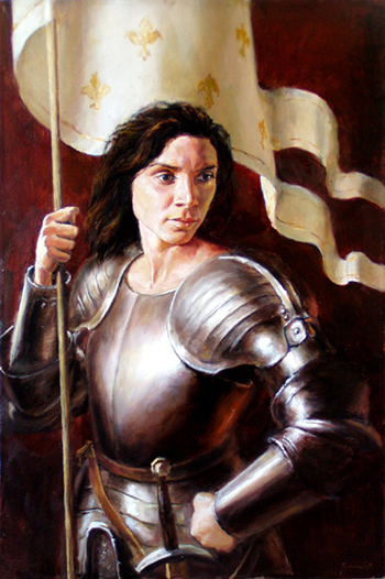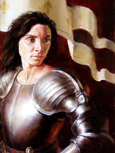 Необычный заказ - портрет девушки в латах средневекового рыцаря. Неожиданный ракурс и экспрессивная композиция портрета, создают воинственный, напряженный и красивый образ женщины-воительницы. флаг Нормандии, отображенный на портрете, подчеркивает образ Жанны д'Арк, борца за свободу. На картине Ваша девушка может предстать не только королевой или светской дамой. Придумывая сюжет для портрета по фотографии можно обратиться к самым различным историческим эпохам и странам.