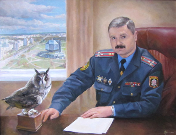 Парадный портрет на фоне окна с видом на городской пейзаж Минска и современный символ города - Национальную Библиотеку Беларуси.